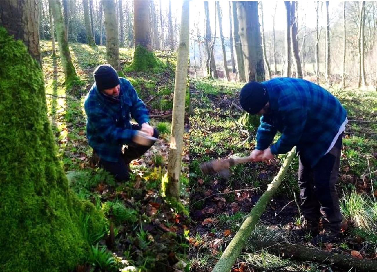 The hafted tools were all used in heavy duty percussive woodwork. As the experiment existed within a larger use-wear programme, the use duration varied. Most of the tool use was performed by CS in the experiment archaeology research training hub (EARTH) workshop at the University of Liverpool. Some experimentation was performed in Alder Car woodland, Silsden, North Yorkshire, UK. This included the felling of a large, approximately 45 cm diameter dead standing sycamore tree, performed by various members of West Yorkshire Bushcraft, who have permissive access to the private woodland. In a separate experiment, CS felled and sectioned into 4 an approximately 10 cm diameter live rowan tree ( Sorbus aucupairia), taking approximately 12 minutes (See Figure 10). Full details of the tools used can be found in Table 1, Appendix 1.