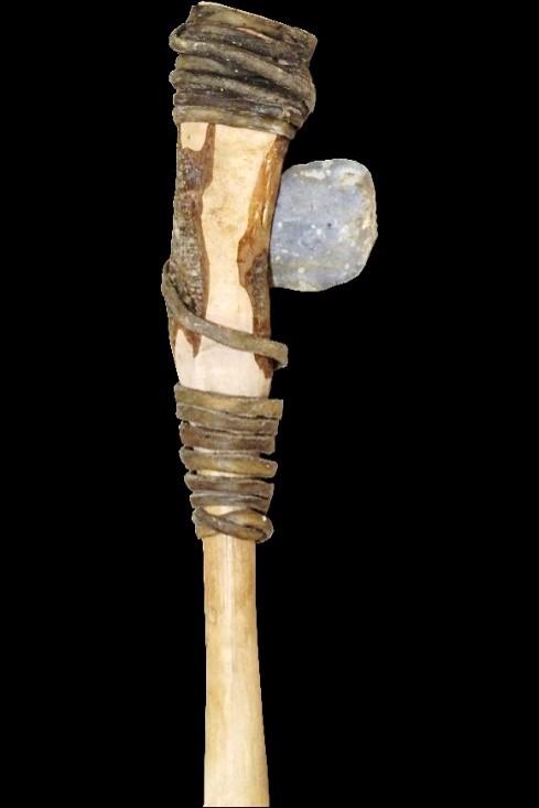The clefted, split axe arrangement, with the handle fully split and the haft closed around the lithic using bindings, was also tested. Despite several designs and materials tested, this design proved unsuitable for high-energy percussive actions, with hafts failing almost instantly.