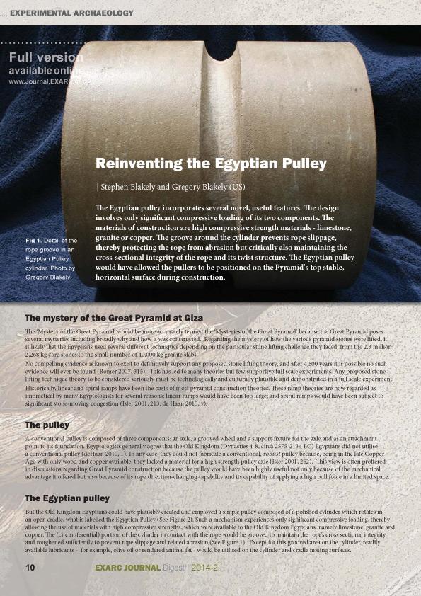 Reinventing the Egyptian Pulley, by Stephen Blakely and Gregory Blakely, proposes a possible solution to moving heavy stone blocks in the building of pyramids. They propose a theoretical Egyptian pulley and test it practically, both in prototype and full scale.