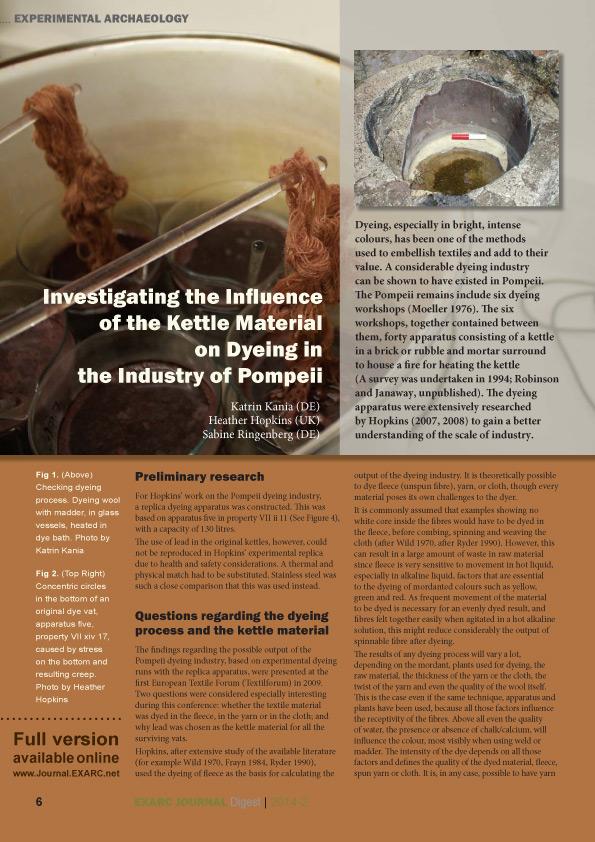 The article, Investigating the Influence of the Kettle Material on Dyeing in the Industry of Pompeii, by Katrin Kania, Heather Hopkins and Sabine Ringenberg presents the results of experiments concerning the importance of metal used to manufacture dyeing kettles in Pompeii.