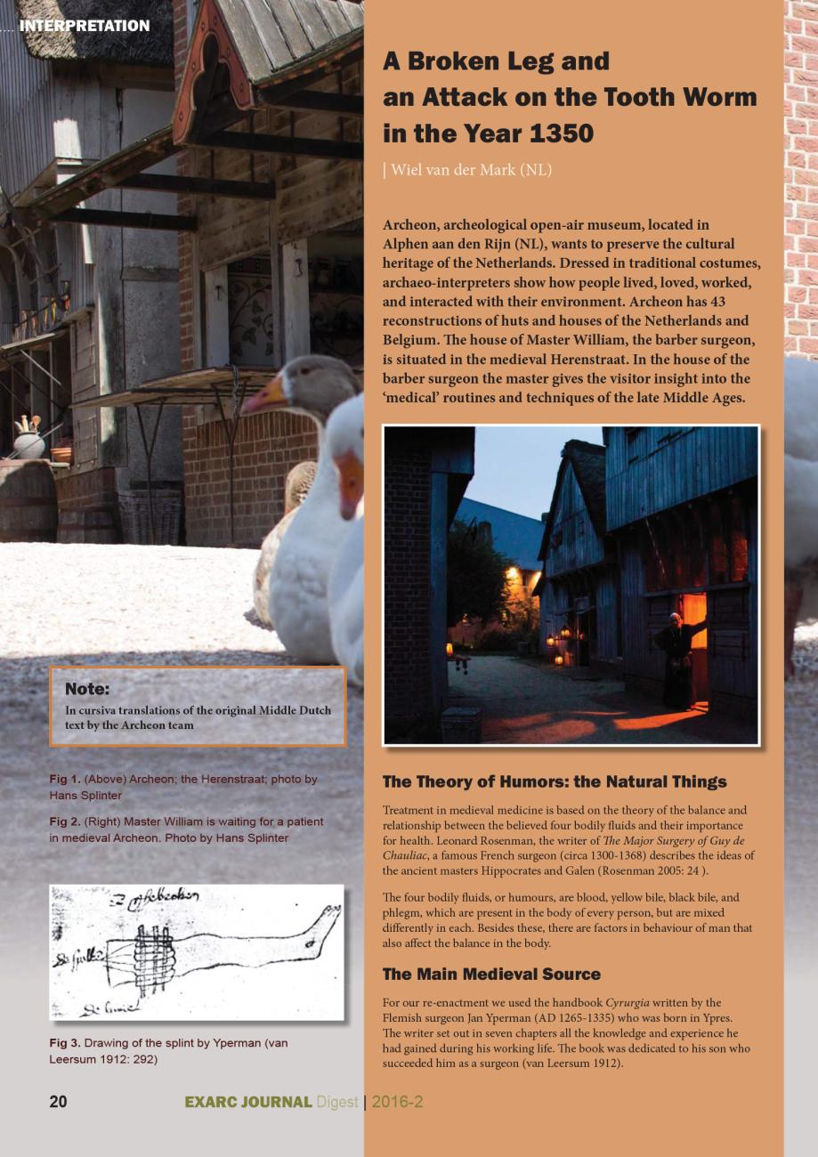 The autumn 2016 Digest showcases choice articles from EXARC Journal issues 2016/2 and 2016/3. We hope that the Journal serves as a discussion and information platform, allowing us to share experiences and track what is happening with archaeological open-air museums and experimental and experiential archaeology throughout the world. The Digest brings samples from different parts of the globe, including Germany, Italy, the Netherlands, Slovenia and the United States. We are especially excited about Katrin Pres’ interview with Mamoun Fansa, in which they discuss the importance of public engagement and communicating archaeological findings. Other articles include a look at the spatial structure (routing) of archaeological open-air museums, a tour with hands-on objects (not just for blind people). Under experimental archaeology, we discuss a Sicilian project with building prehistoric huts and use wear on Late Bronze Age hammers. And do you know how to cook in baskets using hot rocks? Under Interpretation, we discuss medicins in the Middle Ages, including broken legs and an attach on the tooth worm.